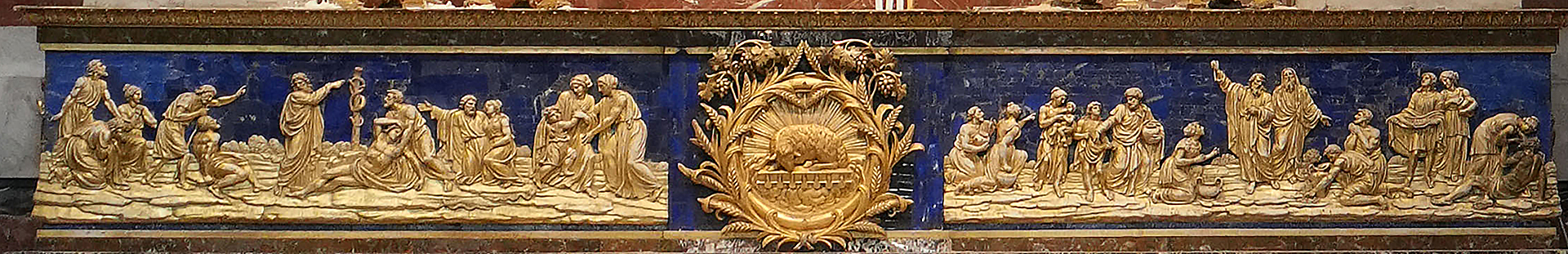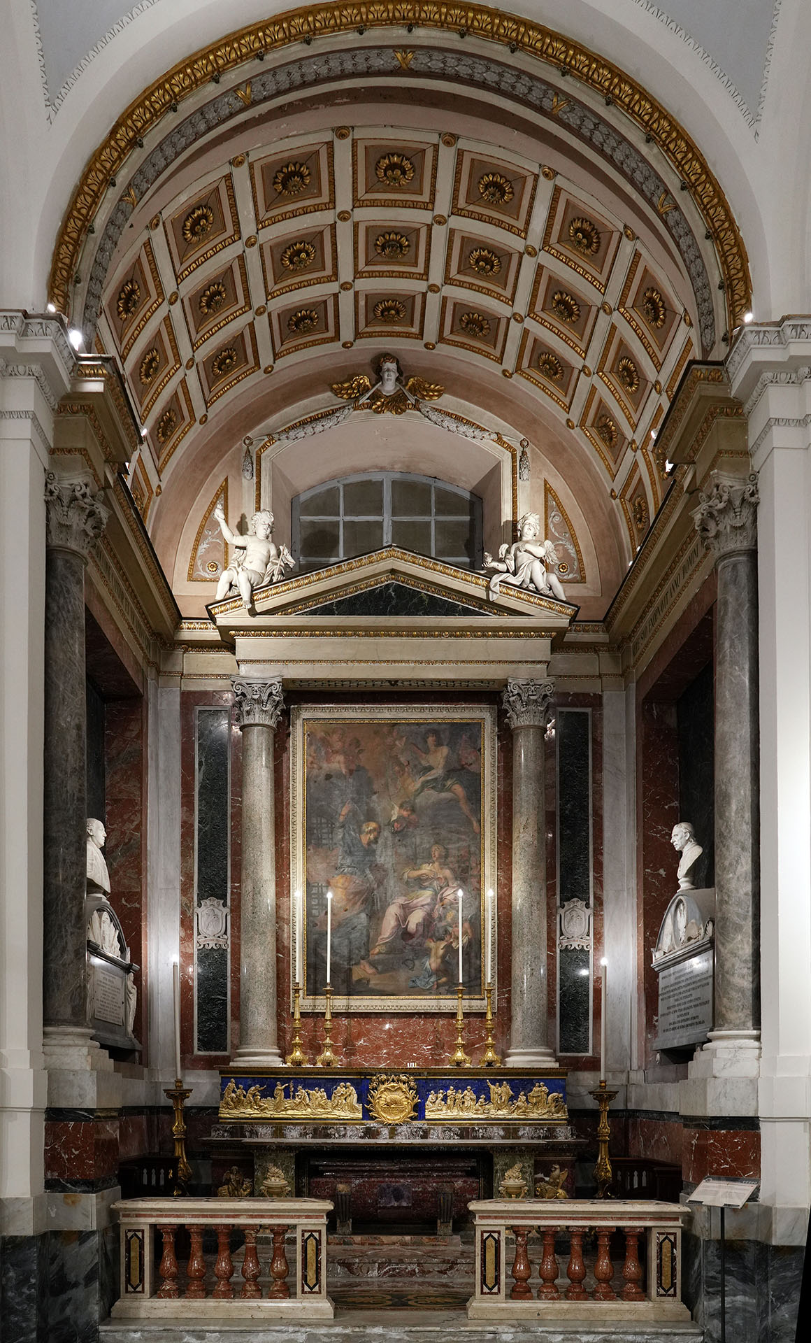 Cattedrale di Palermo, la visita virtuale della Cappella dei Ss. Pietro e Agata L'altare in lapislazzuli è impreziosito da bassorilievi in legno dorato raffiguranti scene bibliche. Sull'altare è posta una tela in cui sono raffigurati San Pietro e Sant'Agata, realizzata dal pittore palermitano Pietro Martorana (XVIII sec.). Per continuare la visita Si riproduce qui sotto lo sviluppo delle Cappelle. Cliccando sull'immagine di una cappella ci si sposta alla sua visita. Cappella del Battistero >> Cappella della Madonna degli Angeli >> Cappella di Sant'Antonino da Padova >> Cappella di Santa Cristina >> Cappella della Concezione >> Cappella dei Ss. Pietro e Agata >> Cappella della Madonna Libera inferni >> Altare del Crocifisso >> Cappella del SS. Sacramento >> Per proseguire l'itinerario consigliato << pagina precedente, Cappella della Immacolata e Beato P. P. Puglisi - pagina seguente, Cappella della Madonna Libera Inferni >>