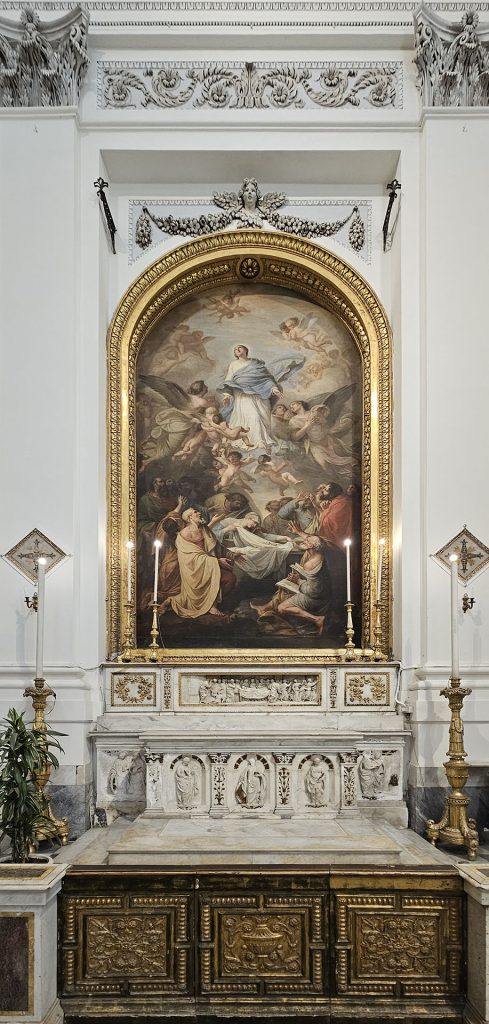 Antonello Gagini, celebre esponente della famosissima famiglia siciliana di scultori, è l'autore dei bassorilievi di marmo bianco incassati nell'altare; essi riproducono in alto la "dormitio Virginis", gli apostoli e gli angeli che conducono Maria alla sepoltura ed in basso le sante patrone palermitane.