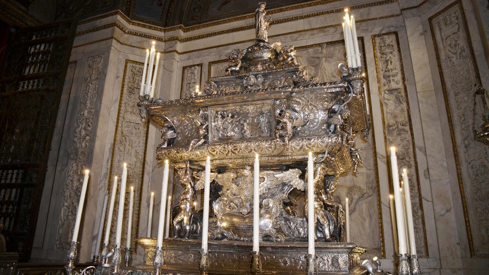 L'urna a reliquiario del 1631 nella Cattedrale di Palermo Essendo volontà del Senato Palermitano di "dimostrare maggiormente l'affetto e la reverenza" alla nuova Santa Patrona della Città decretò la costruzione di una nuova arca per contenere e portare in processione le sue sacre reliquie. La nuova arca, urna a reliquiario, fu costruita nel 1631, su disegno dell'Architetto del Senato, Mariano Smeriglio, dai maestri argentieri Giuseppe Oliveri, Francesco Rivelo, Giancola Viviano e Mattelo Lo Castro con la collaborazione di Michele Farruggia e Francesco Roccuzzo. Un ruolo importante nella composizione dell'arca molto probabilmente lo ebbe il gesuita Giordano Cascini, autore, su incarico del Senato, della storia ufficiale di Santa Rosalai: "De vita et inventione S. Rosaliae", la cui prima edizione, firmata dal Cardinale Giannettino Doria è stata posta all'interno dell'arca insieme al corpo di S. Rosalia. L'opera è strutturata in tre parti sovrapposte. La prima contiene la pedana rettangolare finemente decorata ai bordi in argento sbalzato. Su di essa poggia il fusto con agli angoli quattro putti alati che con una mano sorreggono l'urna e con l'altra uno scudo in cui campeggia la rosa simbolo di Santa Rosalia, già nel nome rosa-lia (lilium). Nel lato lungo tra gli angeli vi è l'aquila simbolo del Senato Palermitano.