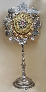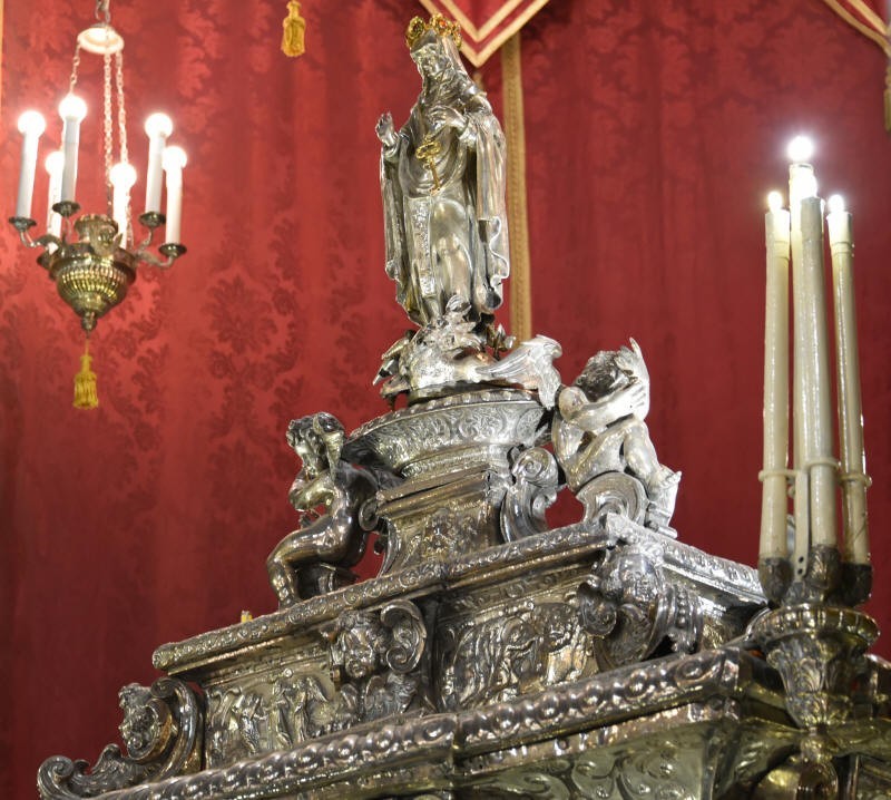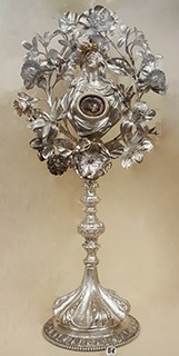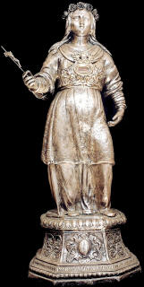 Le arti decorative, che prima venivano chiamate minori, hanno avuto ruolo e funzione "caratterizzante" nella produzione artistica siciliana fin dal tempo dei Normanni che anche in questa forma d'arte realizzarono il sincretismo culturale da loro operato tra gli stilemi dell'arte araba, bizantina e latina d'occidente. Scrive Maria Concetta di Natale: "emerge già nelle opere di età normanna e della prima età sveva quel gusto per i giochi chiaroscurali di luce e per l'accesa policromia che caratterizzerà sempre tutte le opere d'arte decorativa della solare terra di Sicilia". Gli artisti siciliani si arricchirono degli influssi dell'arte decorativa ispano-catalana gotica - tardo gotica e di artisti del continente italiano soprattutto senesi e pisani. Una particolare impronta alla produzione artistica fu data dal Barocco che come scrive la Di Natale "connota l'isola di una ricchezza raffinata pur nella sovrabbondanza dell'ornato, tuttavia mai eccessivo". Molto vasta è la produzione di arte decorativa ispirata a S. Rosalia in metalli, pietre preziose e tessuti, dando così un più che significativo contributo alla documentazione ed alla promozione del culto della Santa. In questa pagina ci limiteremo solamente alle opere di argenteria dando notizia delle due urne a reliquiario realizzate per contenere e portare in processione il corpo di S. Rosalia ed ad alcuni esempi di reliquari che sono molto diffusi in tutta la Sicilia. |