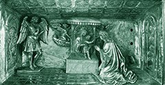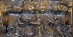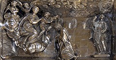 da sinistra a destra le formelle nei quattro lati dell'urna a reliquiario che raccontano il cammino di fede di Santa Rosalia: Vocazione di S. Rosalia - S. Rosalia alla Quisquina - S. Rosalia riceve i fiori - S. Rosalia incoronata da Gesù |