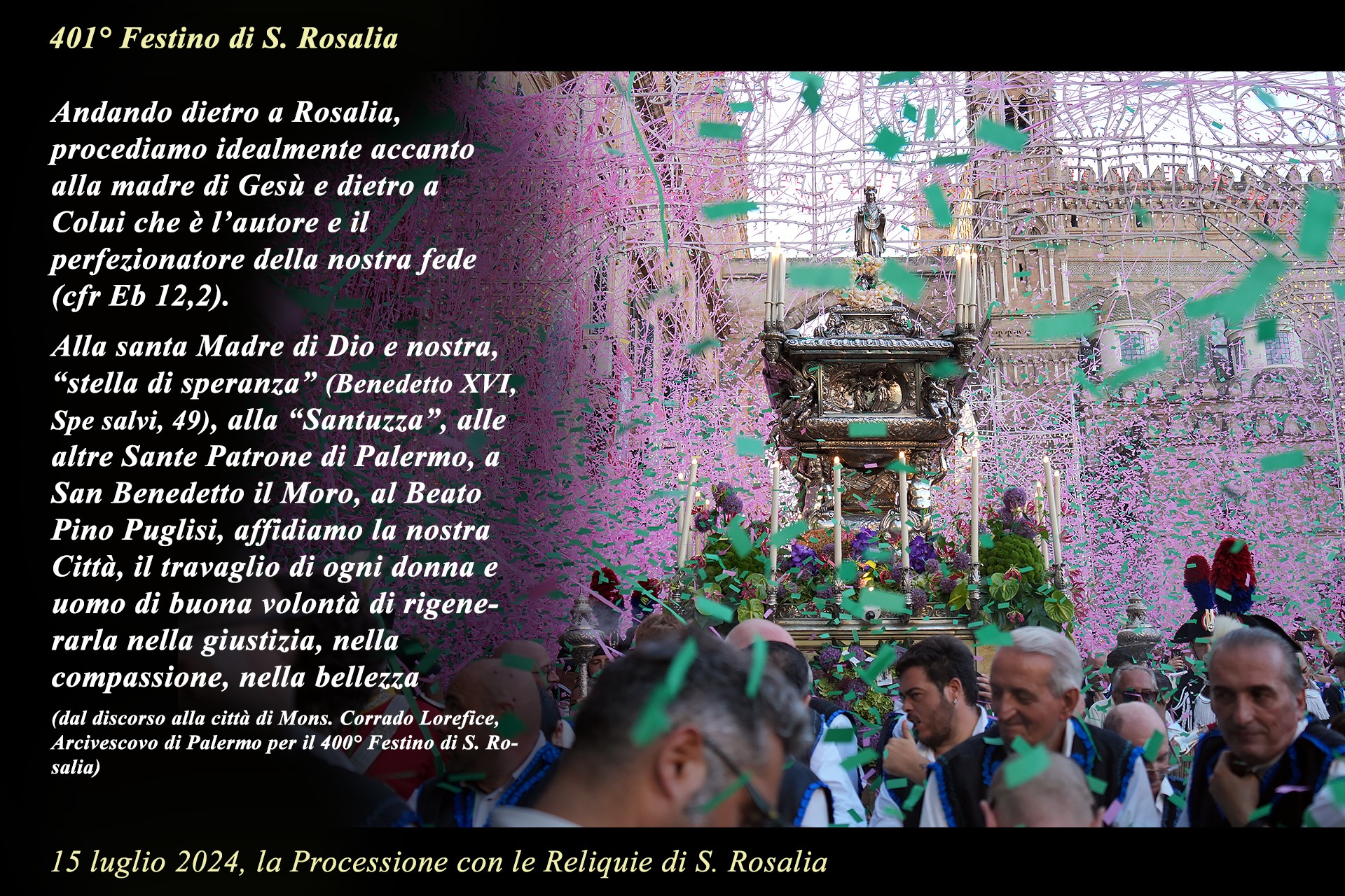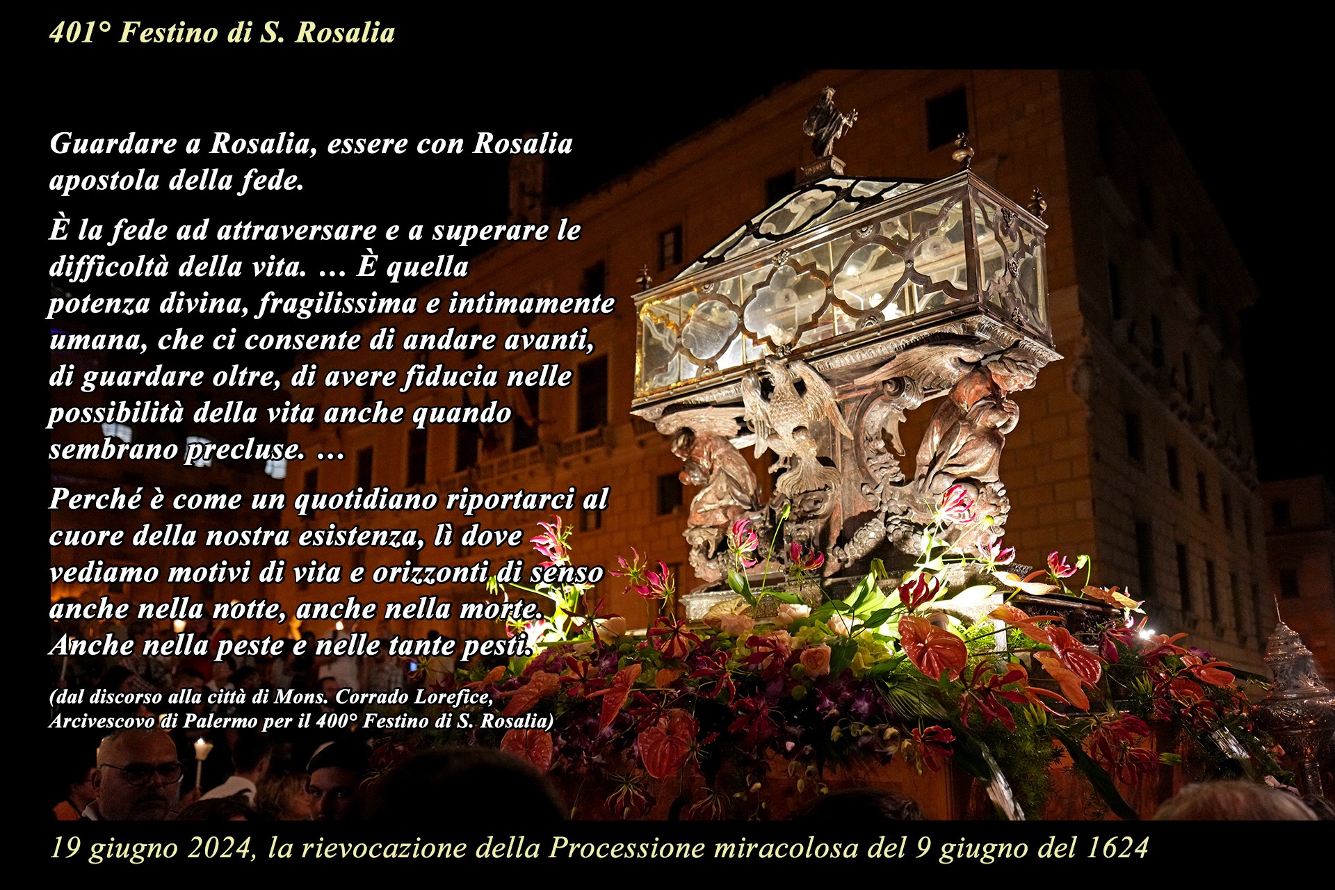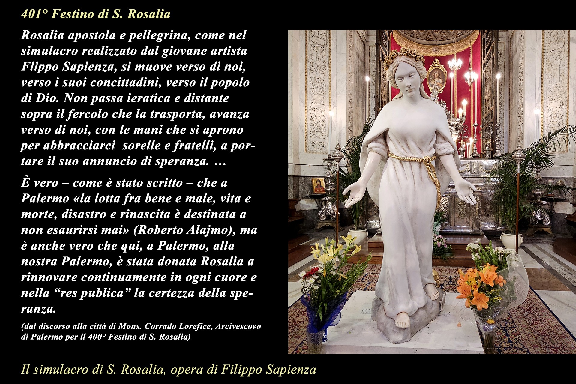 La mostra è una iniziativa della Comunità Parrocchiale della Cattedrale ed ha avuto l’intento pastorale di suggerire un percorso di riflessione e preghiera nel contesto della ormai storica tradizione del pellegrinaggio a S. Rosalia, nei giorni del Festino, in uno dei luoghi iconici della devozione popolare alla Santuzza.