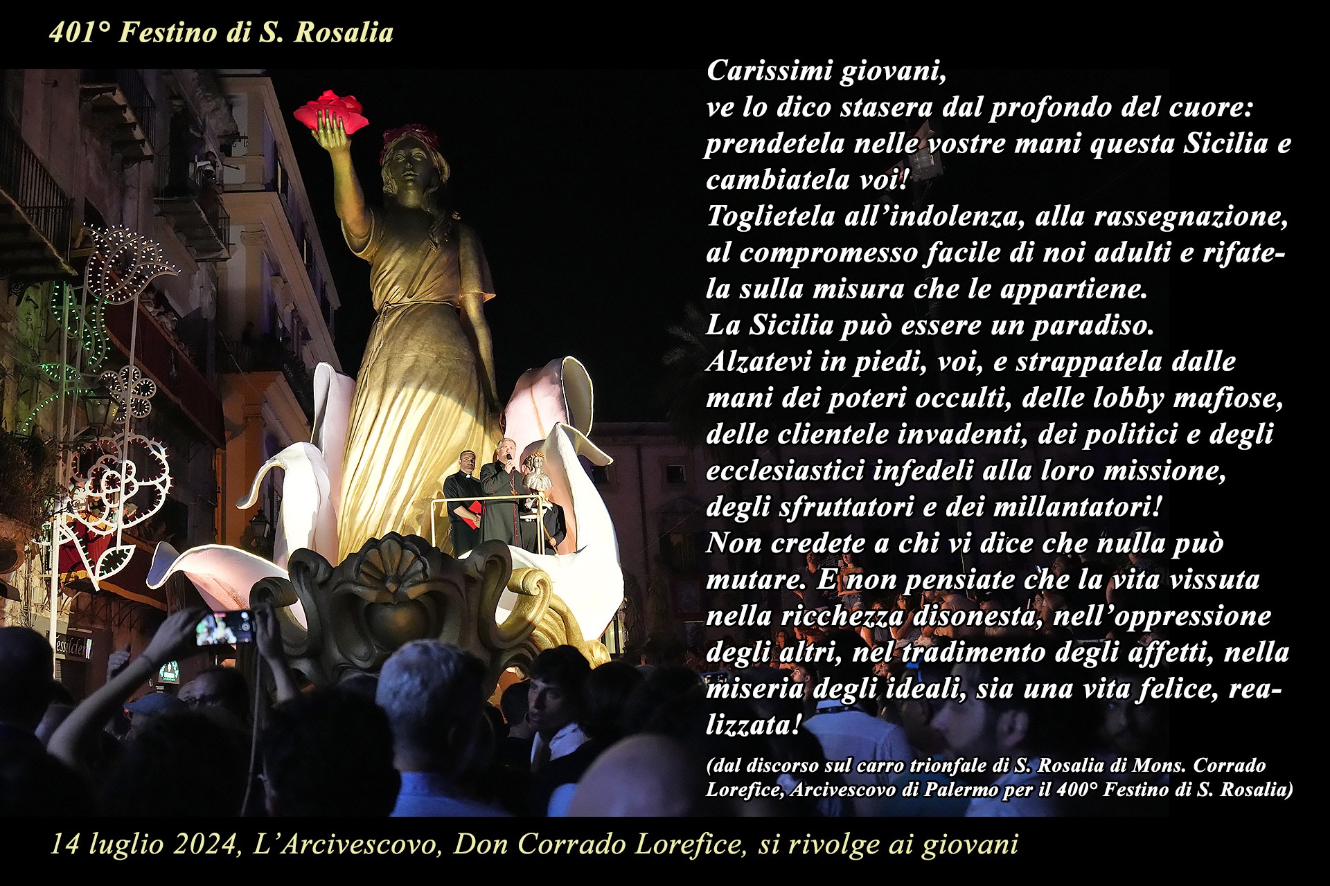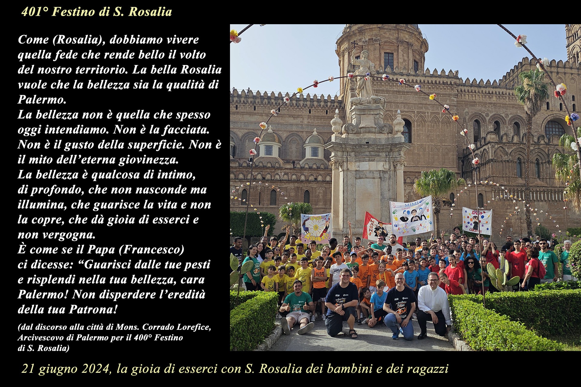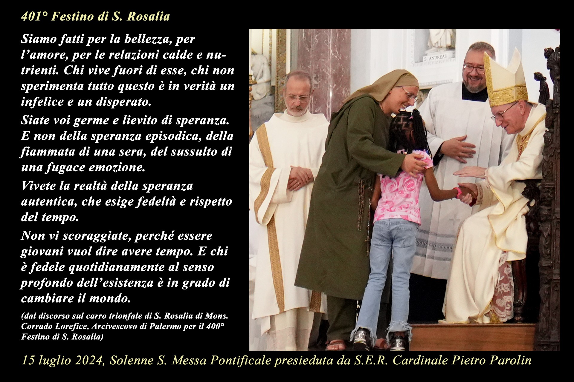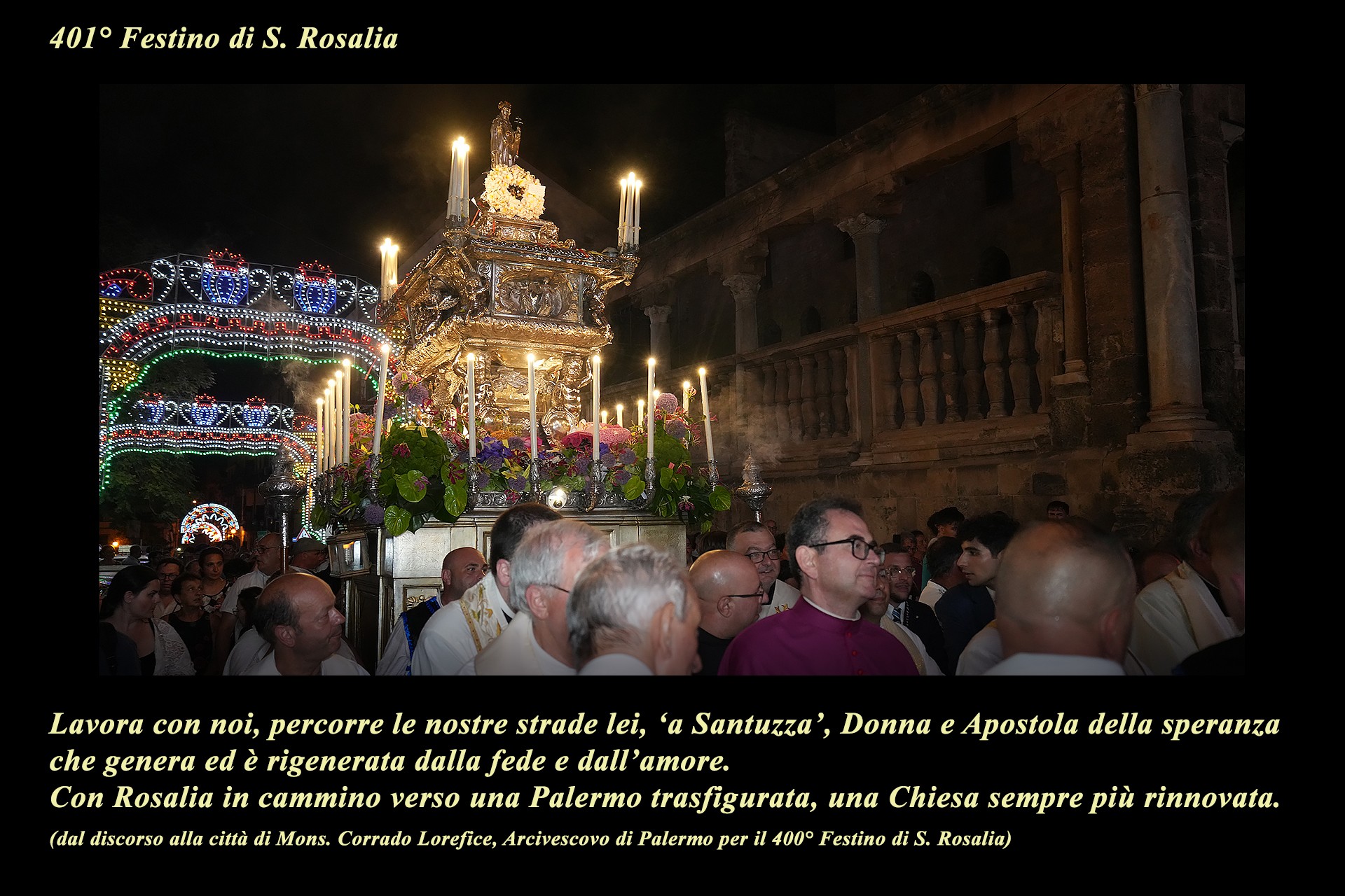 La mostra è una iniziativa della Comunità Parrocchiale della Cattedrale ed ha avuto l’intento pastorale di suggerire un percorso di riflessione e preghiera nel contesto della ormai storica tradizione del pellegrinaggio a S. Rosalia, nei giorni del Festino, in uno dei luoghi iconici della devozione popolare alla Santuzza.