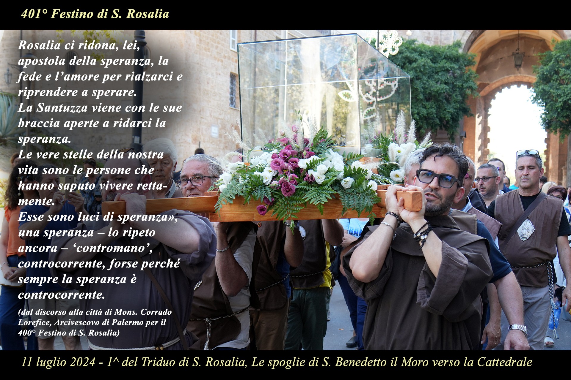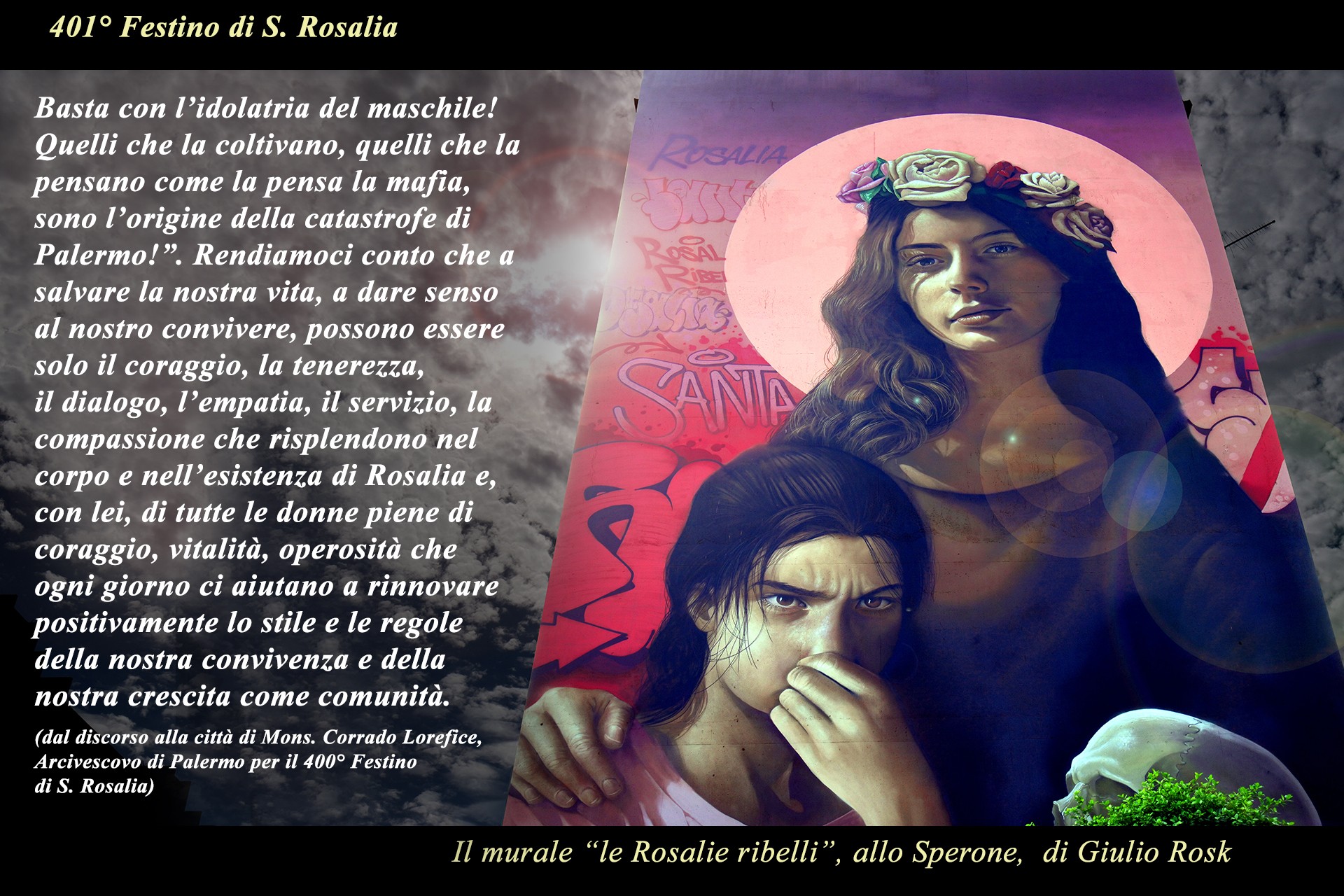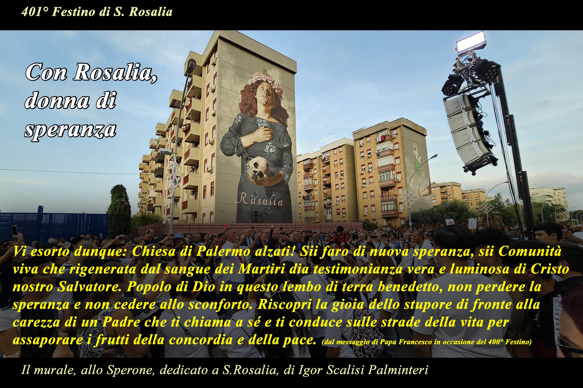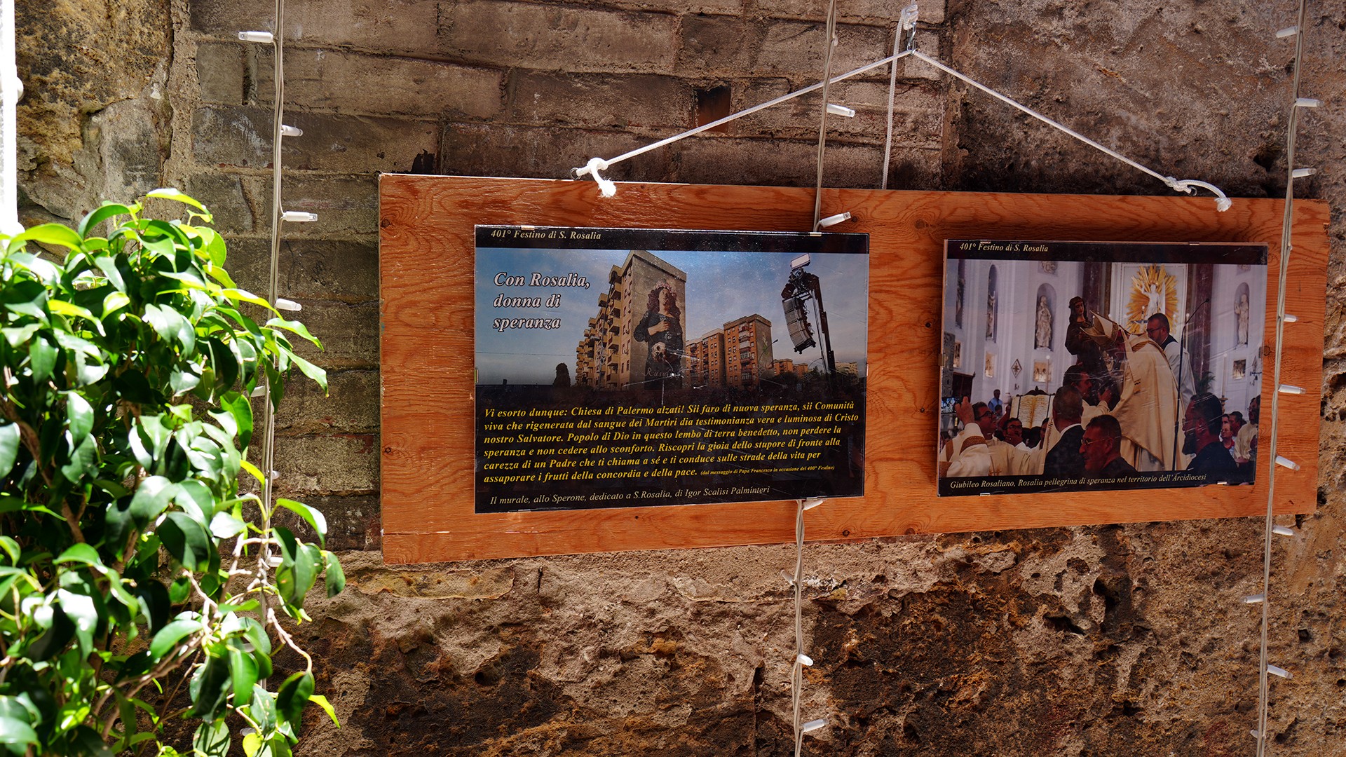 La mostra fotografica "ROSALIA DONNA DI SPERANZA" nel Vicolo Brugnò è stata uno degli eventi collaterali del programma religioso del 401° Festino di S. Rosalia, che sono stati promossi dalla Parrocchia Maria SS. Assunta Cattedrale, dall'Ufficio diocesano per la pastorale sociale e del lavoro, dal Progetto Policoro Arcidiocesi di Palermo e dal Progetto Albergheria e Capo Insieme per la promozione umana.