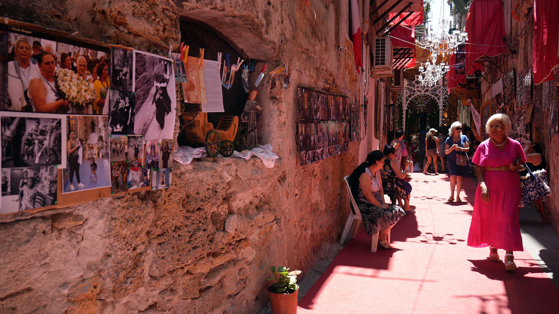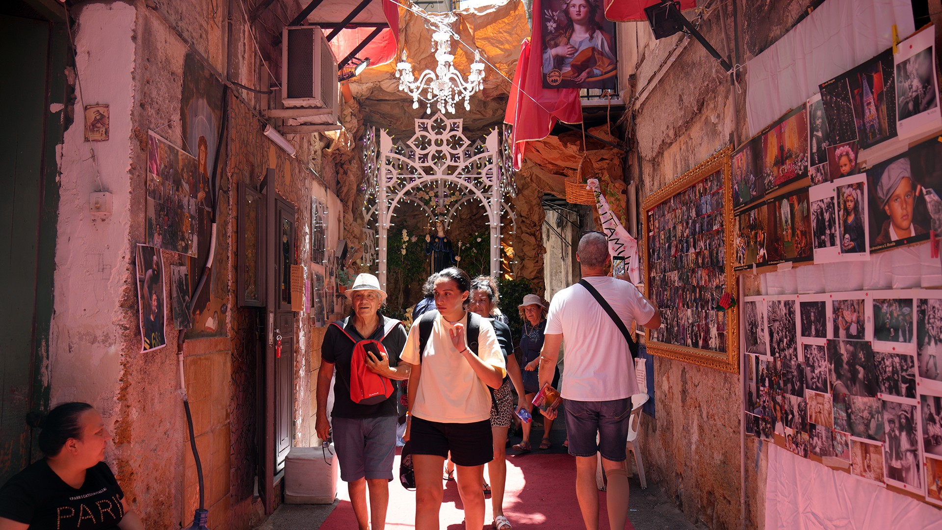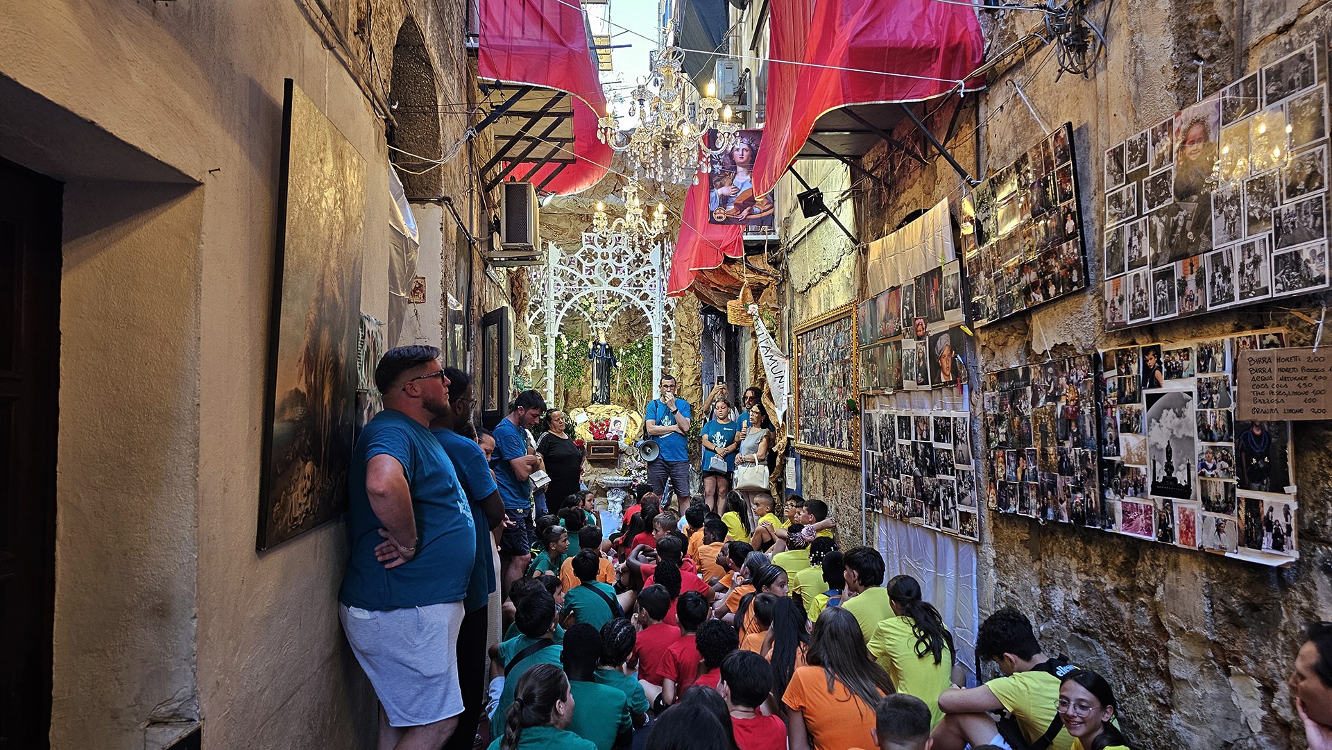Durante i giorni del Festino, migliaia di devoti e no, turisti e curiosi percorrono il vicolo, in uno spazio tempo scandito da luminarie e testimonianze devozionali, amorevolmente accolti dai suoi abitanti, fino all’altare di solito posto nella simulazione della grotta sul Monte Pellegrino, soffermandosi in preghiera, anche laica, come dimostrano le immagini che seguono